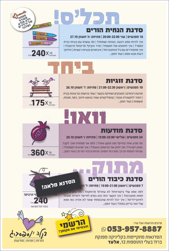 ההרשמה לסדנאות החורף: הורות, זוגיות, כיבוד הורים ומודעות החלה! לרישום: 053-9578887
